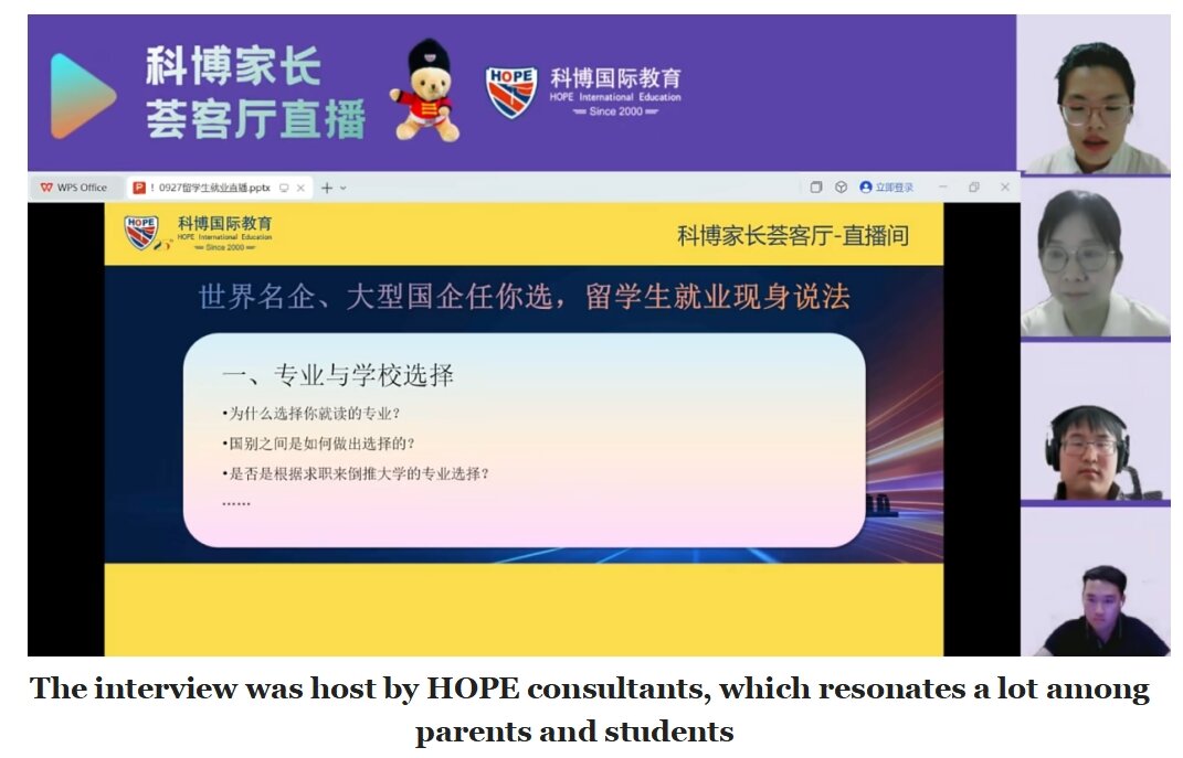 The live broadcasting of the HOPE interview with students on 28th September, with its authentic case studies and enthusiastic reception, provided a vivid sample for observing the development paths of international students, Mao and Shi, HOPE’s students graduating from University of Edinburgh UK and National University Singapore respectively. The dialogue between the two students, one building a career at Google UK and the other returning to a large state-owned enterprise in China offered a profound revelation of the diversity and rationalization trend in the career choices of students.