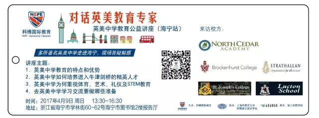 在4月9号那一天,多所著名英美中学走进海宁,现场答疑解惑。想知道都有哪些学校吗?让小编我一一为您道来~