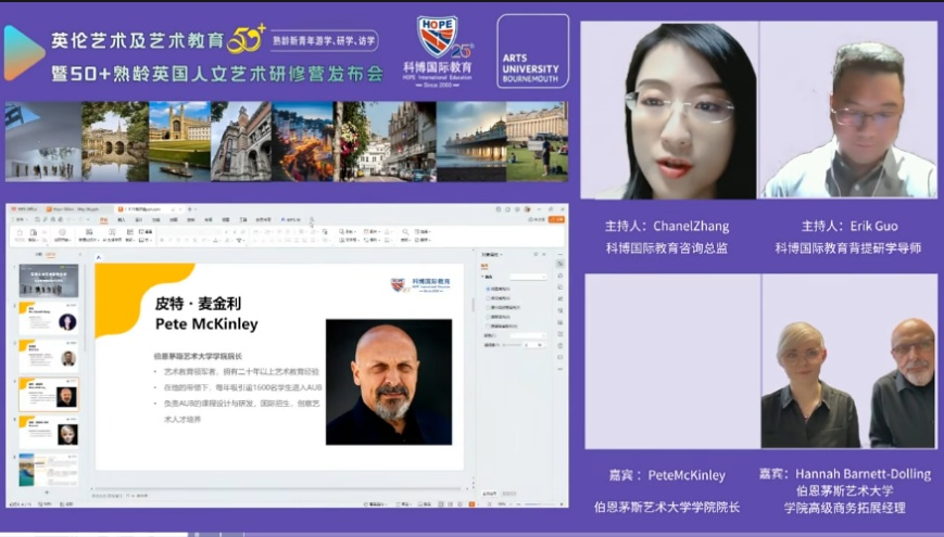 During the online event, Mr. Pete McKinley, Manager of AUB Academy and Ms. Hannah Barnett-Dolling, Senior Business Development Officer of AUB Academy introduced arts education in the UK and AUB, and the 50+ programme, and they were also interviewed by the host, Ms. Chanel Zhang, Counselling Director of Hope, to give audience more understanding of this programme. In the end, Mr, Eric Guo, Marketing Director of Hope, the former “Gold Badge Guide” in Hangzhou, with 20+ years’ international tour guide experience, shared some important points of safety issue for the tour, particularly for the 50+.