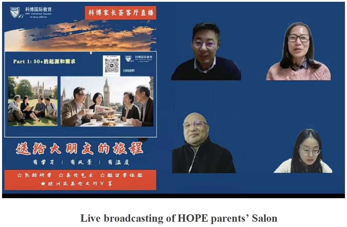 On the evening of 28th November , the HOPE Parents Online Salon invited Daniel Zheng, MD of Hope, Nancy Wang, the former principal of an international school in Shanghai, and Julie Zhou, Hope’s Project Manager of Study Tour, to discuss a trendy topic “study abroad for 50+, the 3rd age”! This online session, not only broke the boundaries of traditional retirement planning but also sketched a vibrant picture of a second chapter in life.