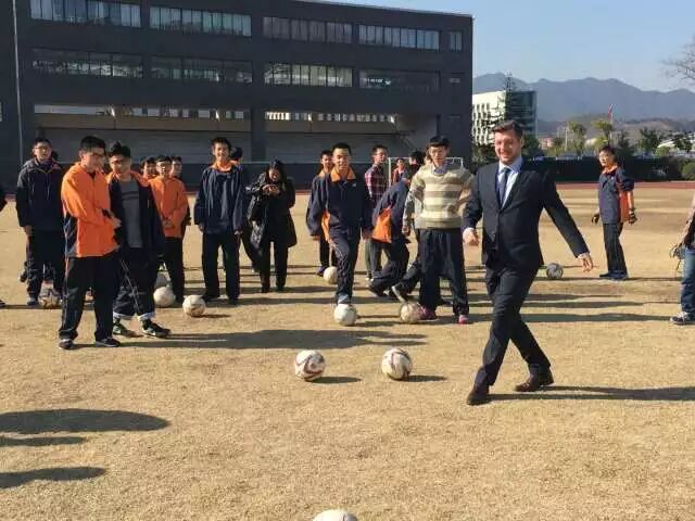 在操场上,Craig Mcdonagh 和Arran Quickfall见到了正在上体育课的学生踢足球,并且兴致勃勃地和他们玩了起来。
