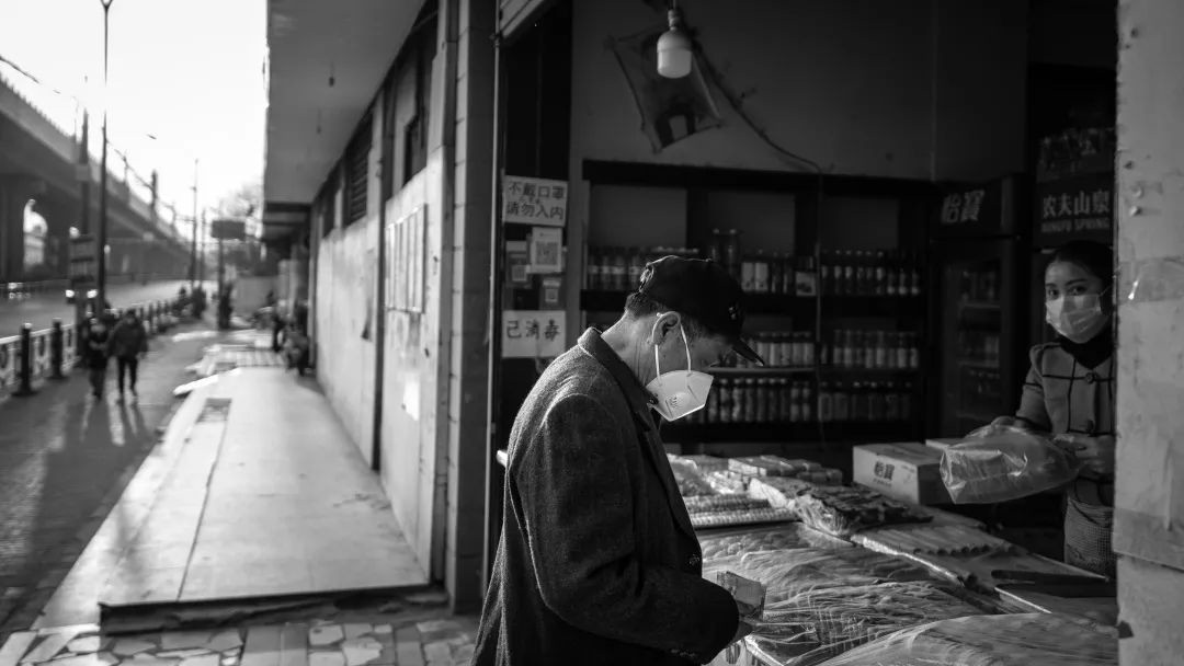 说明:拍摄于3月5日,南京马群地铁站附近,戴着口罩买糕点的老人和店家。