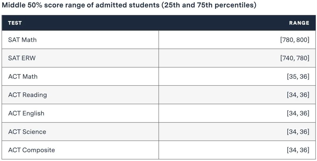 从性别上看,今年MIT入学新生中男生占49%,女生占48%,两者人数相当。MIT也公布了这些录取学生的标化区间,作为宇宙最强理工校,申请者的SAT/ACT成绩自然也是高出天际,排名前25%的学生几乎都是满分!