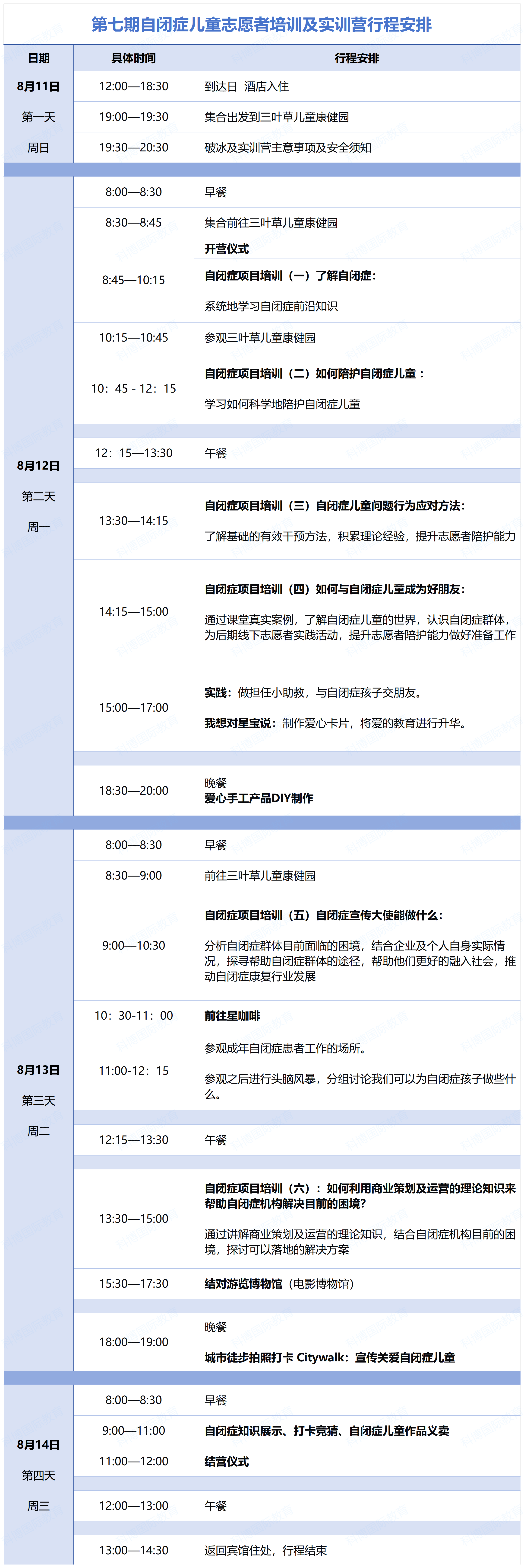 费用包含自闭症儿童志愿者项目培训费、营地活动费、四天三餐费用(除第一天晚上,第四天中餐后营地活动结束)、市区内交通费、住宿费(3晚)等。